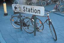 - dans les gares (qui sont souvent aussi une jonction avec d'autres modes de transports publics), dans lesquelles les équipements de stationnement doivent être fermés et surveillés de façon permanente. Ils peuvent être payants. Leurs heures d'ouverture doivent au moins couvrir celles de la gare. Au cas où le stationnement n'est pas situé à proximité de l'entrée de la gare ou des quais, il doit être clairement signalé. Un service de réparation des vélos peut également être installé à proximité. Il est également recommandé de prévoir, outre ces stationnements "fermés", des stationnements pour vélos à l'extérieur de la gare et à proximité de l'entrée, même s'il ne s'agit que d'arceaux ou de poteaux sans plus. Voilà qui incite les cyclistes à utiliser les stationnements fermés et surveillés tout en réduisant le stationnement sauvage ;