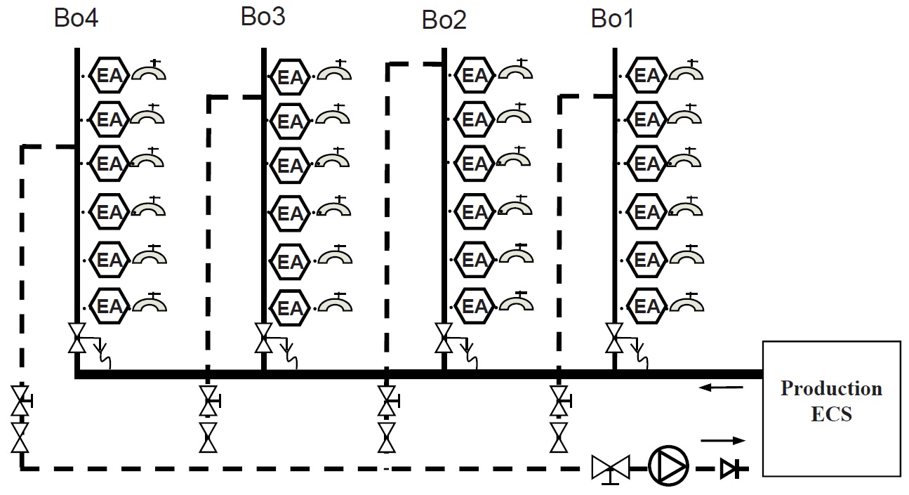 On peut aussi représenter ce schéma sous la forme « linéaire », la particularité de ce type de représentation étant qu’elle est adaptée à toutes les configurations de réseaux ECS (figure 30). L’inconvénient majeur est qu’il n’y a pas de représentation dans l’espace (2D) du bâtiment. Il n’est pas possible de situer graphiquement les boucles dans le bâtiment.