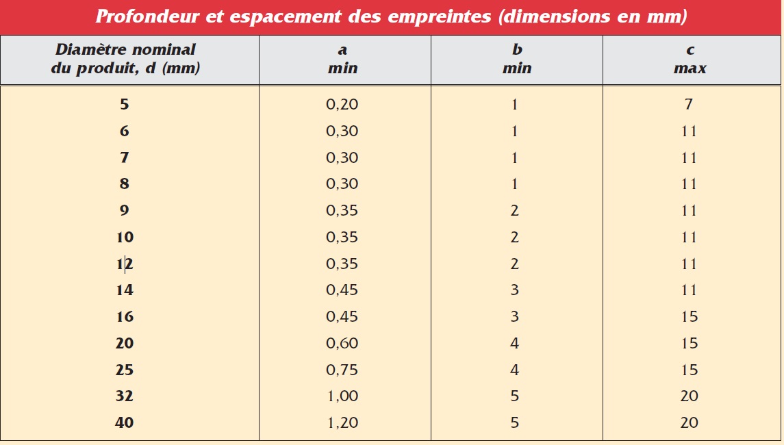Les armatures montrent au moins deux champs de verrous présentant un espace uniforme. Les nervures peuvent exister ou non ; quand elles existent, leur hauteur (a') ne doit pas dépasser 0,15 d (d : diamètre nominal du produit).