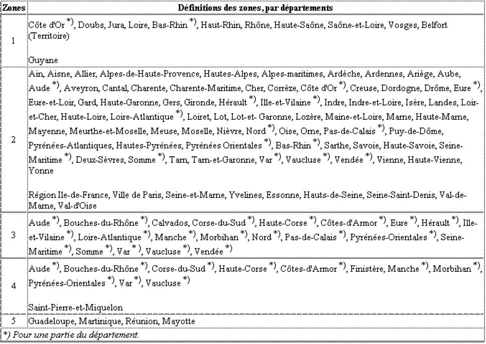 Les définitions de ces cinq zones sont rappelées ci-après. =>Définition des 5 zones par départements