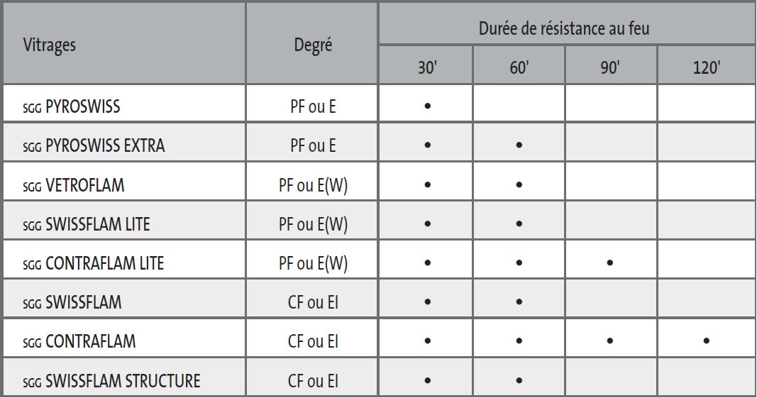 Vitrages pare-flammes transparents: SGG PYROSWISS SGG VETROFLAM Verre armé pare-flammes SGG DRAVEL (0,50 m² maxi) Vitrages coupe-feu transparents : SGG CONTRAFLAM 30, 60, 90 et 120 SGG SWISSFLAM 30 et 60 |
