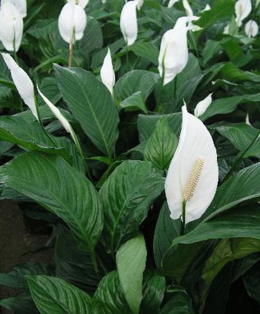 De la famille des aracées le spathiphyllum présente delarges feuilles vernissées et de grandes fleurs blanches. Entre 20 et 60 cm de hauteur, voire plus, le spathiphyllum se contente de peu de lumière (floraison plus faible) mais nécessite un arrosage généreux.